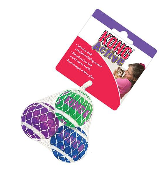 KONG Active cat toys promote healthy exercise and fulfill cats' instinctual desires to chase, hunt and capture. Why let dogs have all the fun? KONG Cat Tennis Balls boast nonabrasive felt and won't harm teeth during play. Cats won't be able to resist interior bell, encouraging exercise in indoor cats.