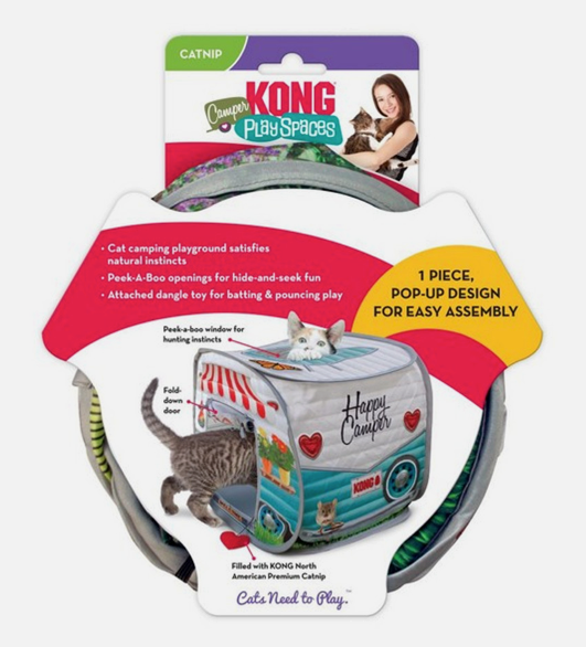 Kong PlaySpaces Camper features a clever camping enclosure that satisfies a cat's natural hiding needs. The window, door and sunroof entice hide-and-seek fun while providing an instinctual outlet. The dangling toy entices bat and pounce fun, while the Kong North American Premium Catnip stuffed within the toy extends the engagement. A one-piece, flexible design allows for easy assembly and storage.
