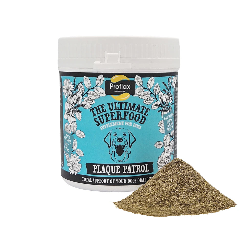 Proflax Plaque Patrol is a 100% natural supplement designed to support healthy teeth, gums, and fresh breath in dogs. Formulated with seaweed and a blend of herbs traditionally used to maintain oral hygiene, it helps reduce the buildup of plaque and tartar for a cleaner, fresher mouth—naturally.